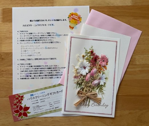 お子さんが産まれたお友達に!母の日、敬老の日、お誕生日に!プレゼントに最適なハウスクリーニングギフトカード下記の1~5のメニューの中から1つをお選びいただけます。